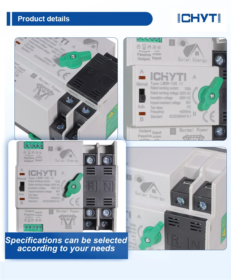 చైనా సప్లయర్స్ ICHYTI డిస్కౌంట్ ఆటోమేటిక్ ట్రాన్స్ఫర్ స్విచ్ అనేది ఇటీవలే అభివృద్ధి చేయబడిన మైక్రో గృహ విద్యుత్ బదిలీ స్విచ్. సాధారణ లేదా విడి విద్యుత్ వనరు సరిగ్గా పనిచేస్తుందో లేదో నిర్ణయించడం దీని ప్రాథమిక విధి. సాధారణ శక్తి వనరు అసాధారణంగా మారిన సందర్భంలో, విడి విద్యుత్ వనరు వెంటనే సక్రియం అవుతుంది. ఈ లక్షణం విద్యుత్ సరఫరా యొక్క కొనసాగింపు, విశ్వసనీయత మరియు భద్రతను నిర్ధారిస్తుంది. గృహ కక్ష్య-రకం ఇన్స్టాలేషన్ కోసం ప్రత్యేకంగా రూపొందించబడింది, ats ఆటోమేటిక్ ట్రాన్స్ఫర్ స్విచ్ దిన్-రైల్ పవర్ డిస్ట్రిబ్యూషన్ బాక్స్లలో ఉపయోగించడానికి ఉద్దేశించబడింది.