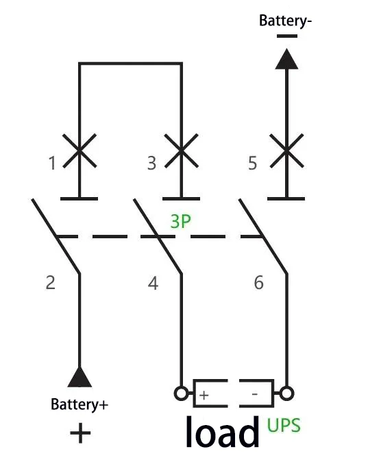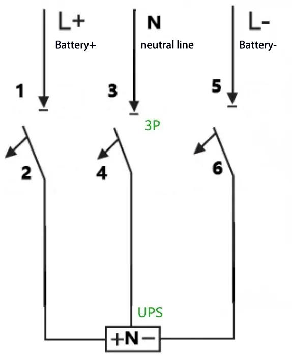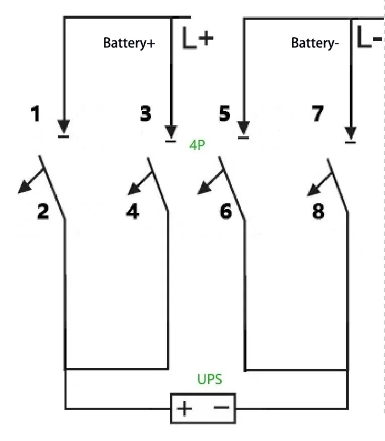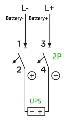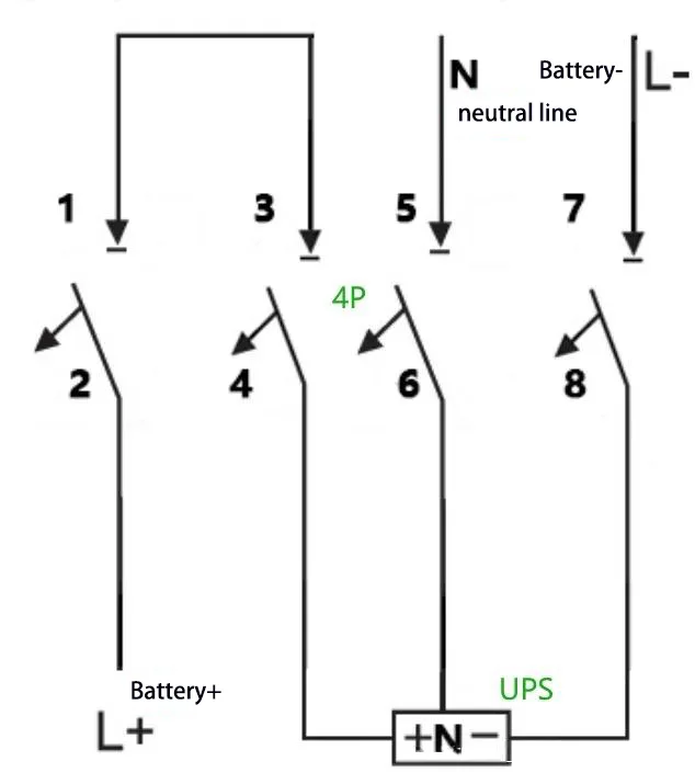 ఇ:ఉదాహరణకు: 40 kVA సామర్థ్యం కలిగిన UPS కోసం, 40 సెల్ల రేటింగ్ బ్యాటరీ స్ట్రింగ్ మరియు న్యూట్రల్ వైర్ కనెక్షన్ (ఈక్వలైజింగ్ ఛార్జ్ వోల్టేజ్: 14 V × 40 = 560 V, అంటే ±280 V), గరిష్ట ఆపరేటింగ్ కరెంట్ 40 kVA × 10% ÷ 10 ÷ 10 ÷ 40 గా గణించబడుతుంది. A. A 4P 750 V 150 A సర్క్యూట్ బ్రేకర్ను స్వీకరించవచ్చు, దాని రెండు స్తంభాలు సిరీస్లో అనుసంధానించబడి ఉంటాయి. వైరింగ్ పద్ధతి క్రింది విధంగా ఉంది: